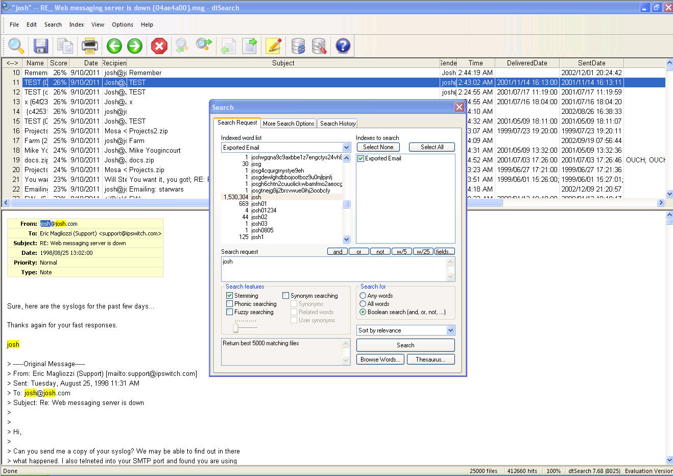 I also tried using Copernic to index a directory of exported EML files and, like X1, it did index the text saw the files as just files rather than emails so I could search on metadata like send date or recipient. It also listed the filename and date in the search results rather than the subject and send date of the actual email.