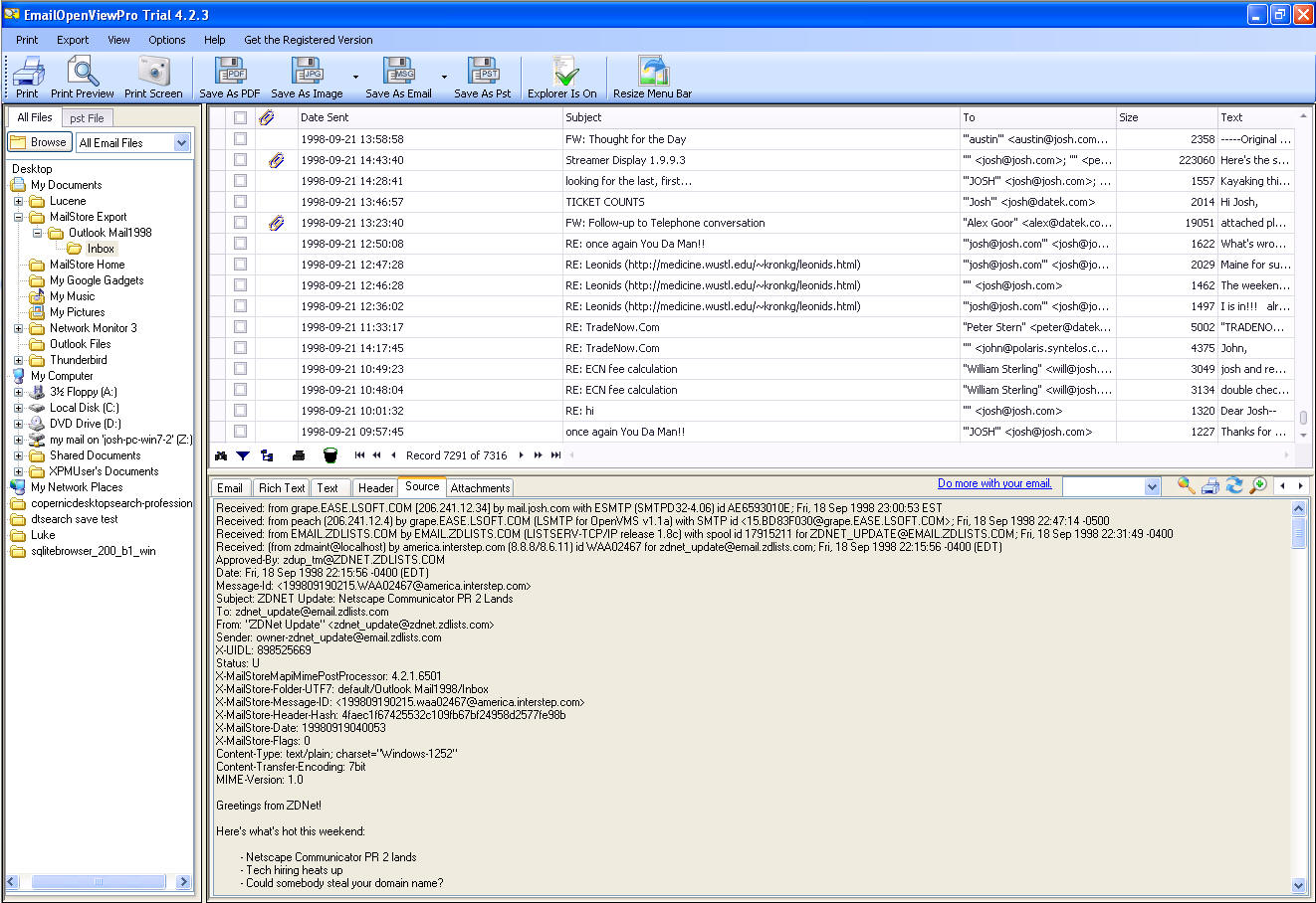It can also do a fairly complete export into standard RFC822 EML files, so you are no longer dependent on your PST files and will always have to option to move your emails to a different platform in the future.