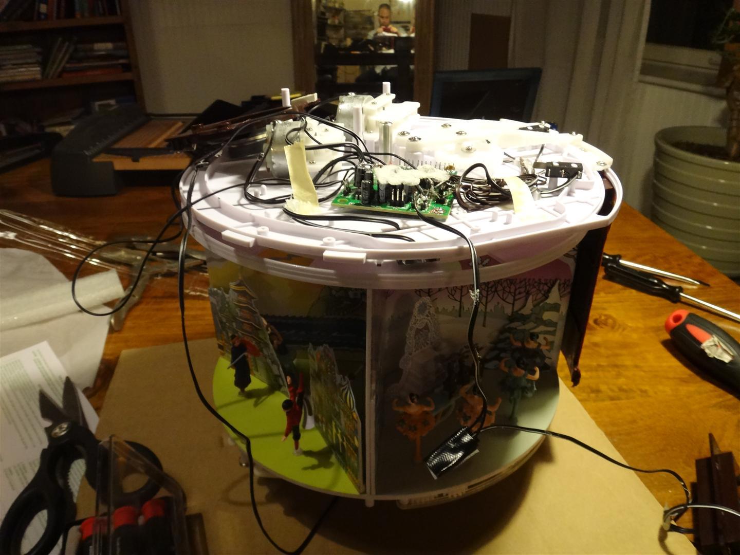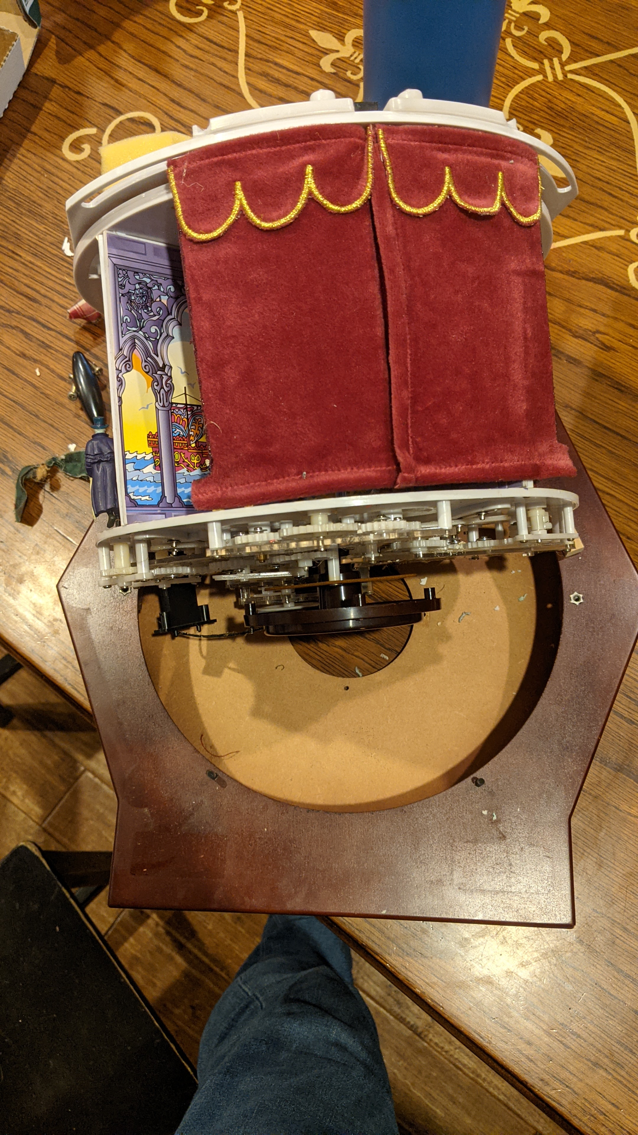 Here is what the bottom of the stage looks like in case you are curious. That wire powers the motor that turns the dancers.