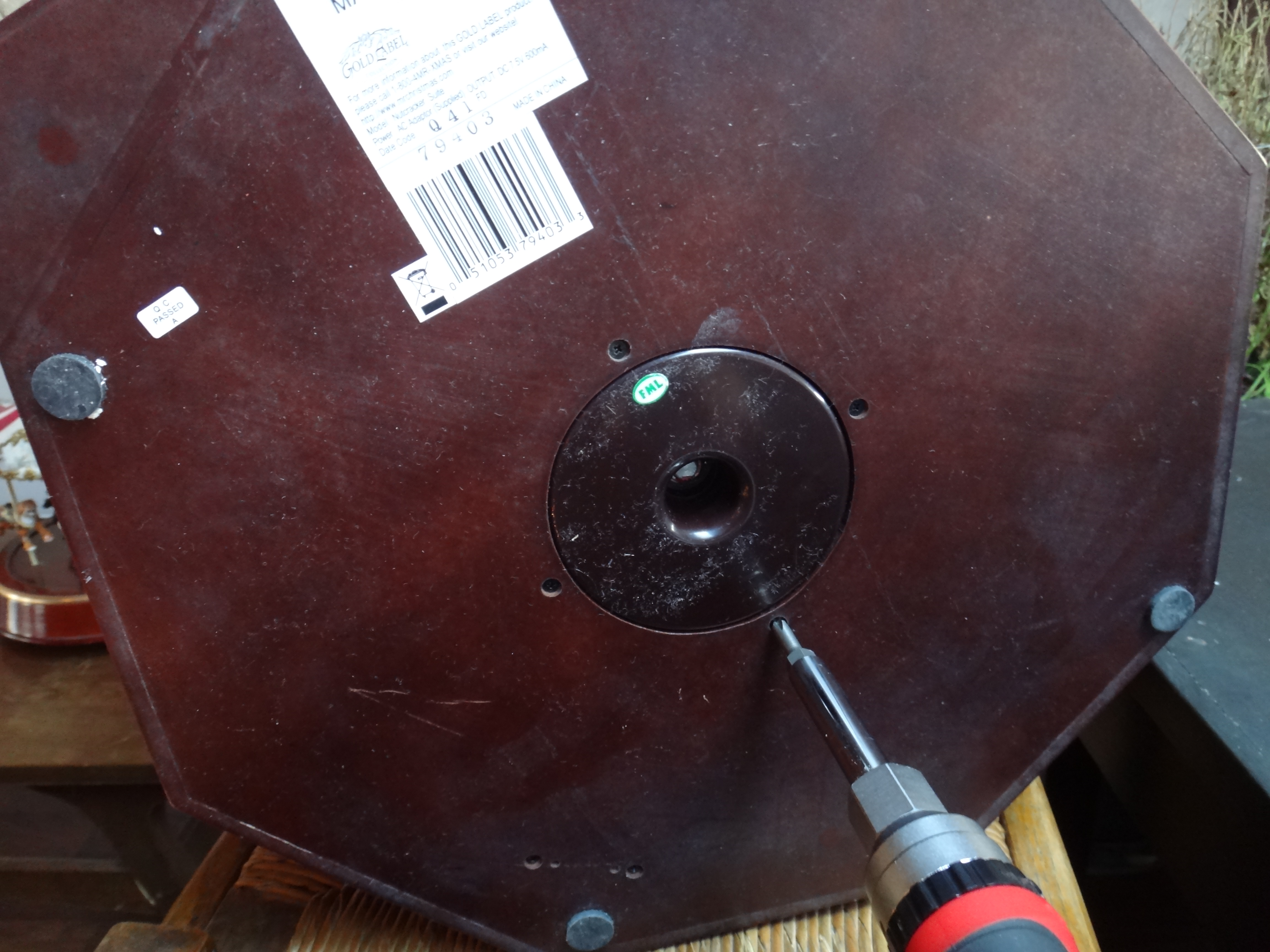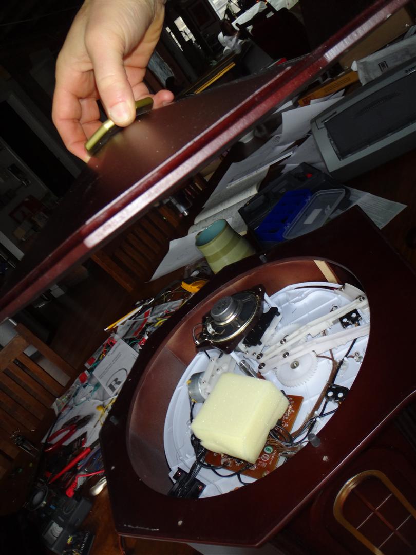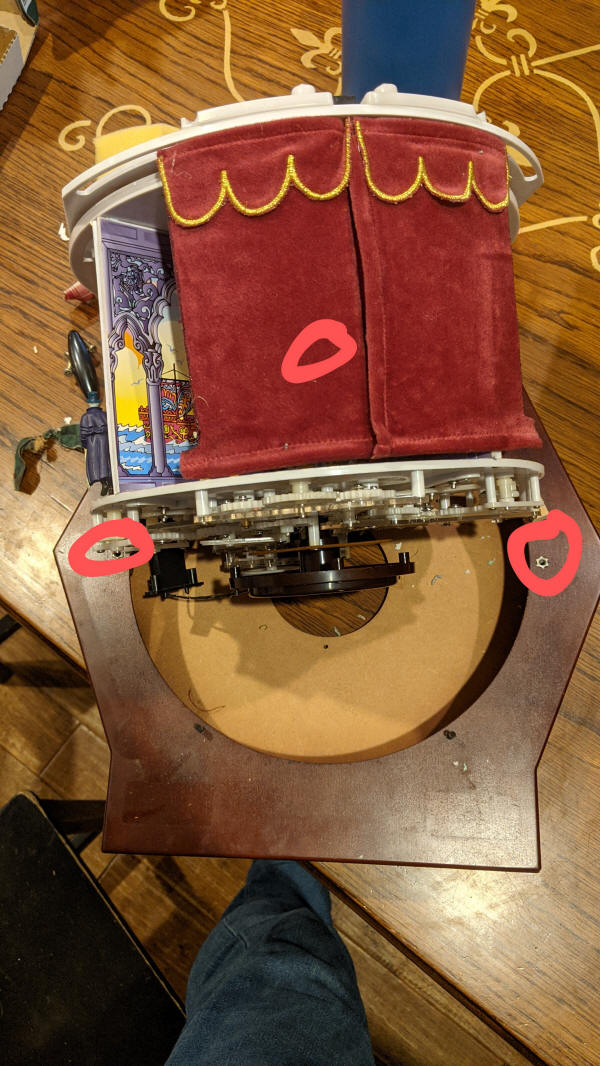If you need to get to the bottom of the stage, that is harder. You'll need to get down there if the figures aren't turning, or if there is a problem with the power switch/plug or volume control knob.